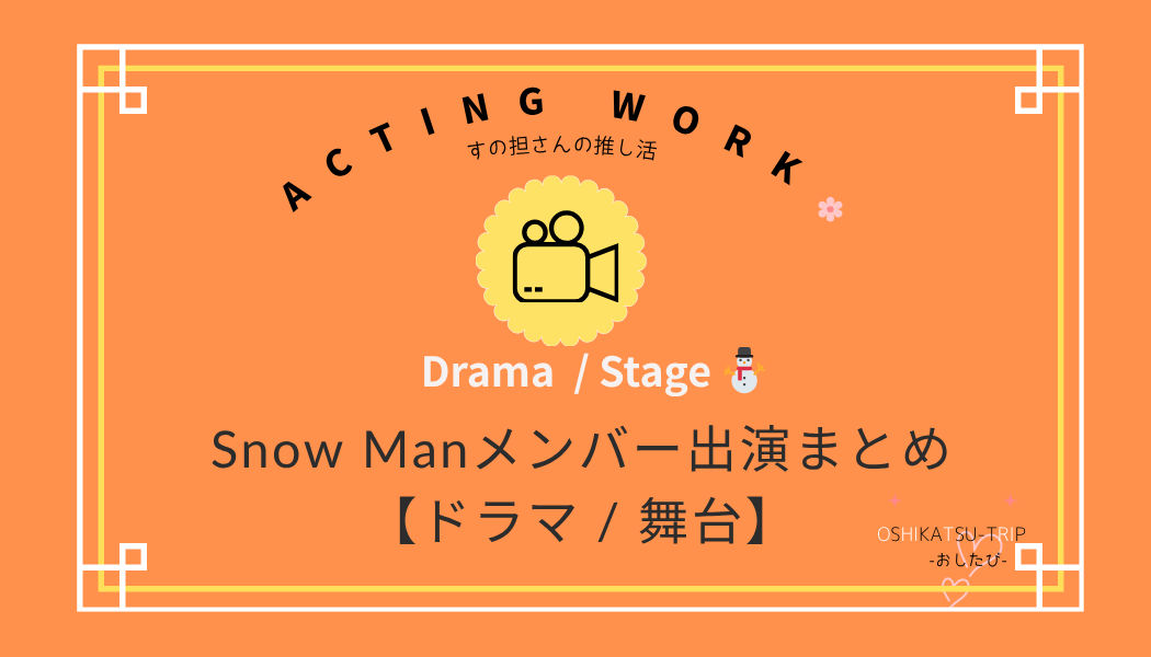 🎬 Snow Manメンバー出演のドラマ・舞台・映像作品情報をまとめました! こちらのページでは、2025年を中心にSnow Manメンバーが出演するテレビドラマ・舞台・映画・配信番組などの最新情報を、出演メンバーごと・作品ジャンルごとに整理してご紹介しています。 📺 いつから放送?/観覧募集🎟 DVD販売は?🌐 配信はどこで見られる? など、遠征組さんや見逃したくない方のために、テレビ局公式サイト/配信サービス情報/番組SNSなどを元に、随時更新中です。 推しの活躍を見逃さず、充実した推し活ライフを一緒に... -